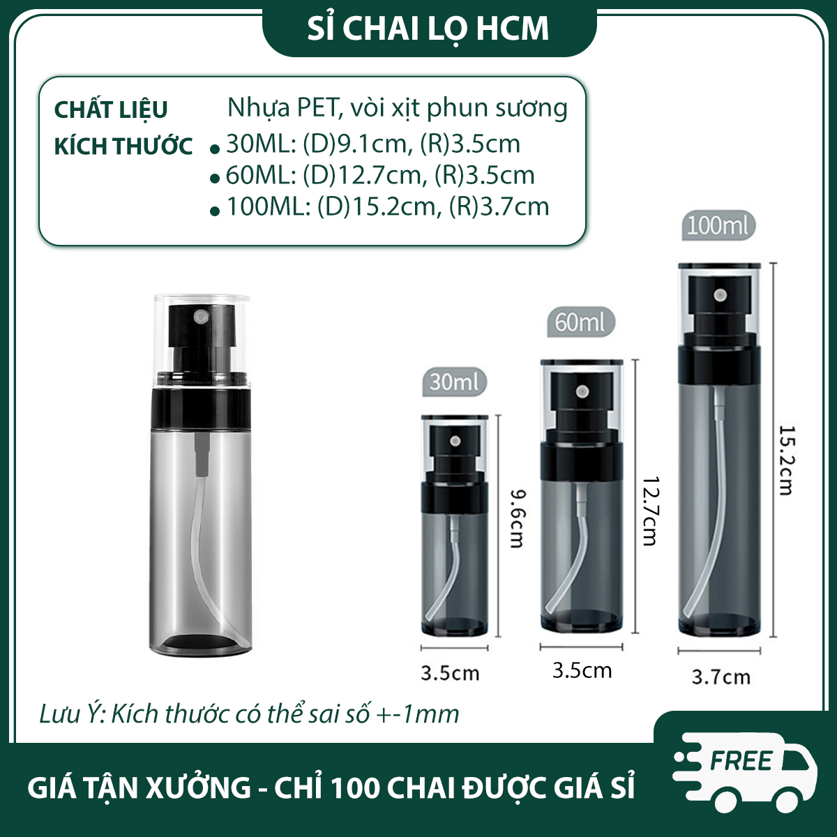 • Dung tích 30ml, 60ml, 100ml
